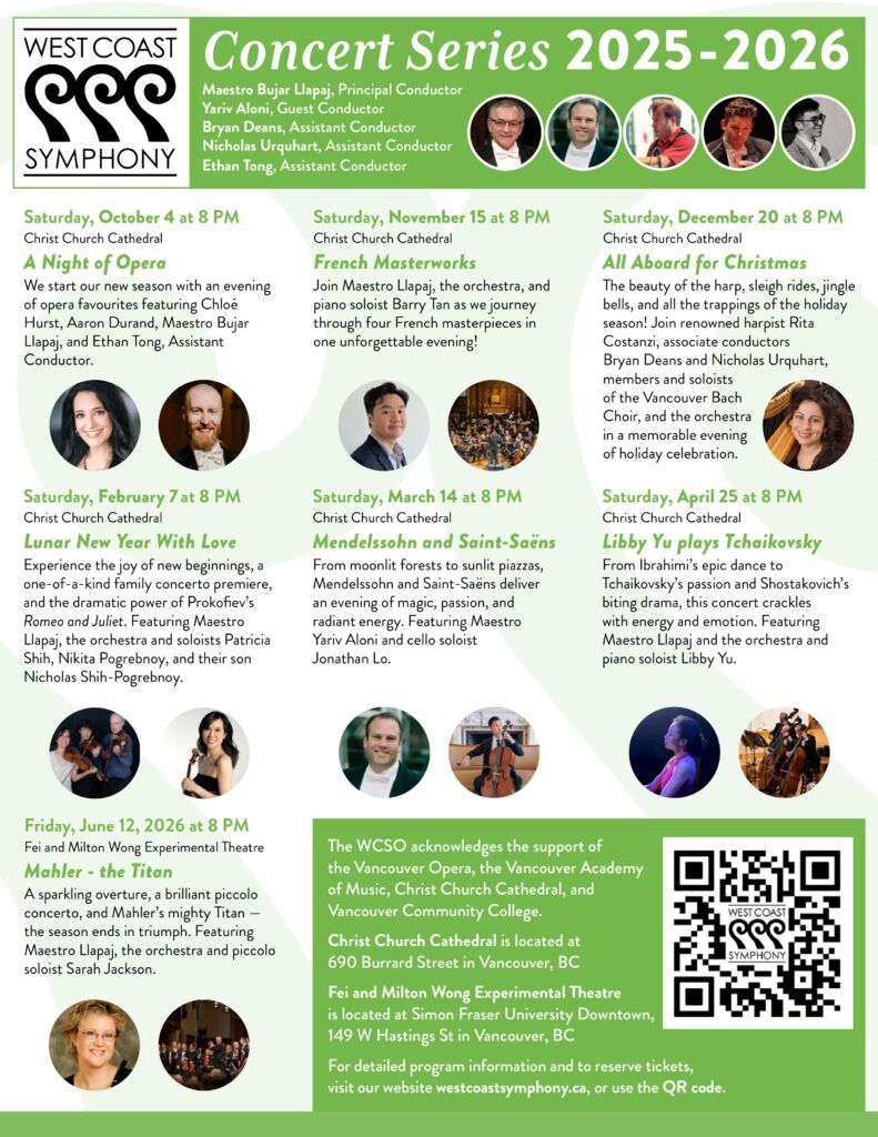 The West Coast Symphony Orchestra launches a new season in grand style with two dazzling Canadian voices: soprano Chloé Hurst and baritone Aaron Durand. From Mozart’s elegance to Verdi’s passion, Offenbach’s wit, Puccini’s romance, and Copland’s vibrant Americana, the evening brims with operatic favourites and orchestral gems. A night of soaring arias, playful duets, and thrilling symphonic moments — the perfect start to a season of unforgettable music.